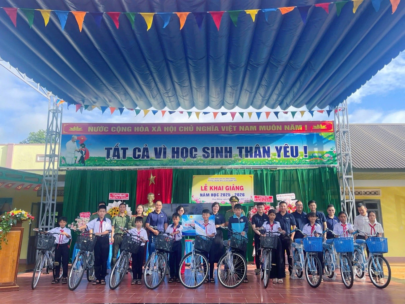 Phần trực tiếp tại trường đã diễn ra trang trọng với nghi thức đón học sinh đầu cấp, chương trình văn nghệ chào mừng đến từ các em học sinh trường và chương trình “Tiếp bước em đến trường” đến từ đơn vị Phòng An ninh kinh tế – Công an tỉnh Đắk Lắk và Ngân hàng TMCP Bản Việt – Chi nhánh Đắk Lắk đã trao tặng 10 xe đạp và 200 quyển vở với tổng kinh phí 20.000.000 đồng (Hai mươi triệu đồng) cho các em có hoàn cảnh khó khăn. Đây là tấm lòng hảo tâm chia sẻ đầy ý nghĩa trước thềm năm học mới.