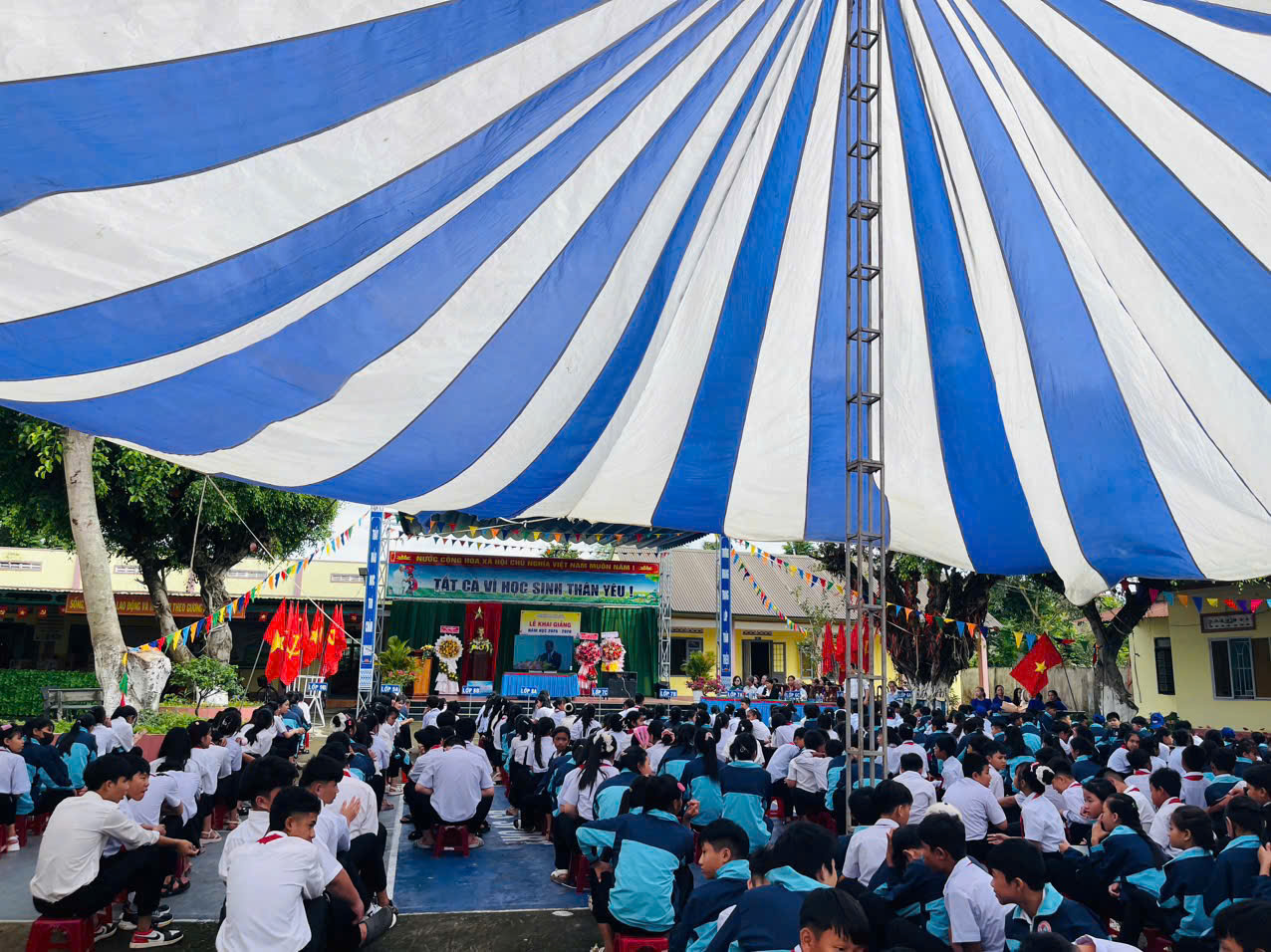 Buổi Lễ khai giảng diễn ra trang trọng và tràn ngập niềm vui, niềm phấn khởi trong khung cảnh đầy sắc màu mùa thu, rợp bóng cờ, hoa.